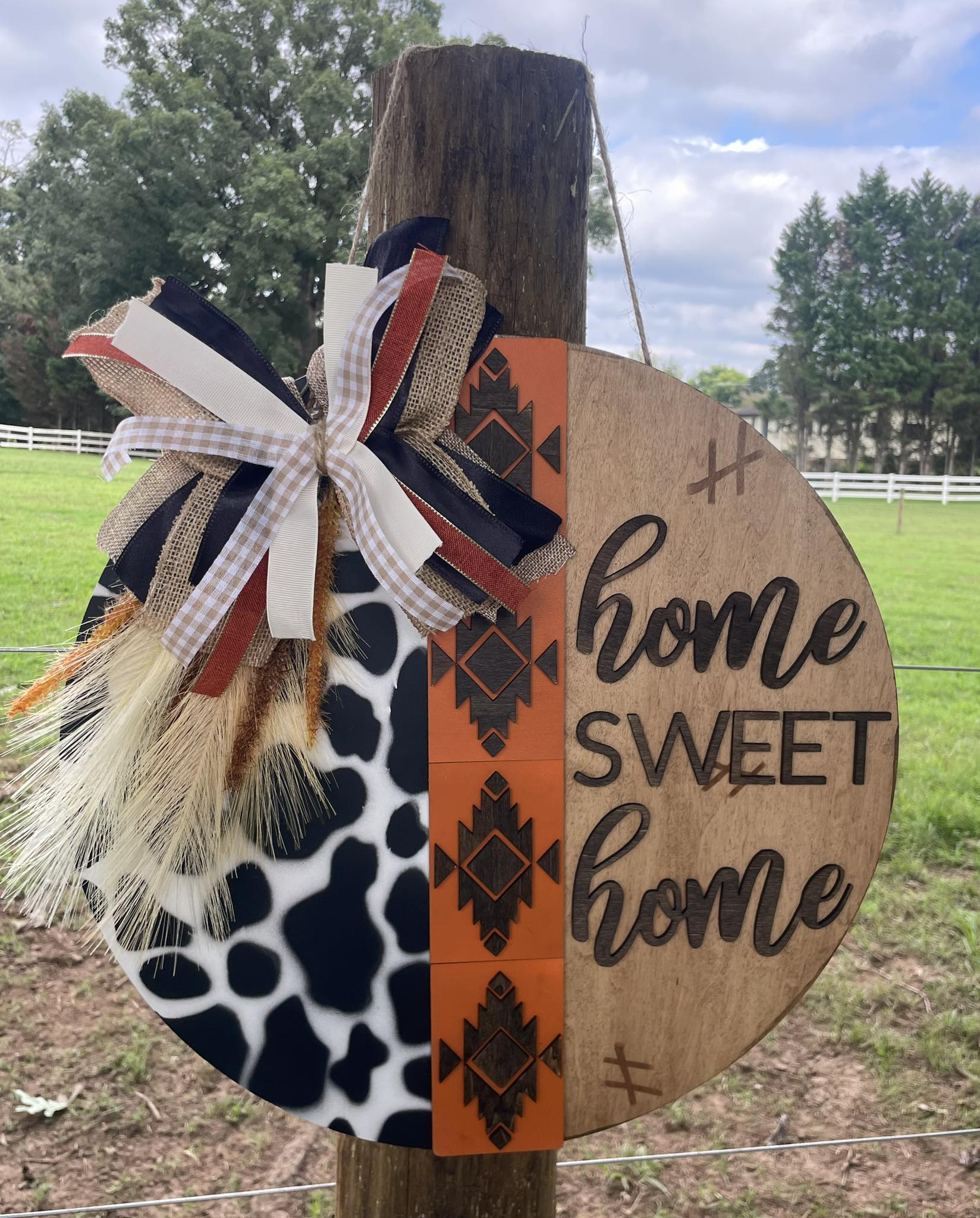 Add a warm and personal touch to your entryway with our custom wooden round door hangers! Stained wood with cow print design and an Aztec center. Does come with bow.